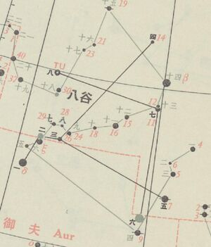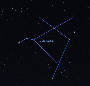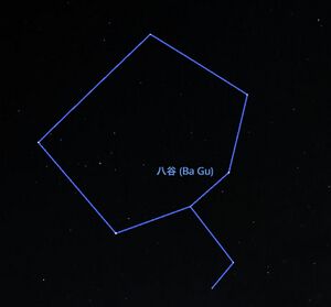 Bā Gǔ ( Eight Kinds of Crops, 八穀) is a Chinese constellation consisting of eight stars located within the constellations Lynx, Auriga, and Camelopardalis. It belongs to the asterisms introduced by Gan De and originated during the Han dynasty.