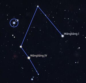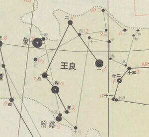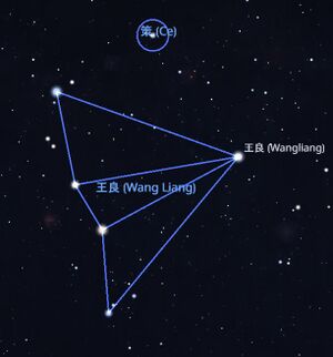 Wáng Liáng (王良) is a Chinese constellation comprises five stars located within the Cassiopeia. It was created by the Shi school in Western Han dynasty, based on the incorporation and integration of earlier constellations.