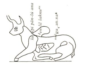 The inscription below the image of a reclining humpbacked bull (zebu?) on the Seleucid tablet O 175 describing the ritual for making a sacred drum [G. 73; TU, 47 rev.]; in [Livingstone 1986, 194] erroneously for mulGU4.AN.NA.