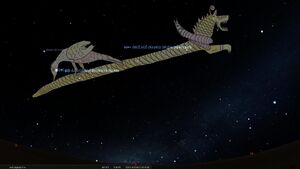 A drawing of the ancient Babylonian constellation is reproduced here as figure on right, showing its various parts including its head, horns, feet, middle and tail. Here mulUGA, 'The Crow' (Corvus), on its tail pecking at the its very tip. A drawing of this constellation is preserved on VAT 7847+AO 6448, but the place where the asterism's back legs should be is broken, and no surviving cuneiform source makes explicit whether or not there were back legs as well as front legs at the asterims, although famous depictions (e.g. on the Ishtar Gate of Babylon) show (d)MUŠ with front and back legs; note that the back legs are bird legs and they are placed where the Crow stands.