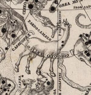 One of the 88 IAU constellations. Plancius (1612) meant and drew the Latin giraffe and not the camel, but the strange word was sometimes misunderstood by other astronomers as camel or as panther.[1] So until the constellations were canonised by the IAU, there were two interpretations of this animal.