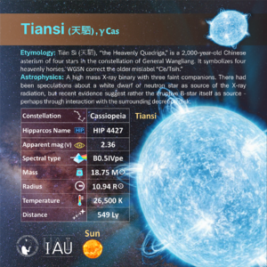 On November 12, 2025 adopted the name Tiansi for γ Cas (27 Cas, HR 264, HD 5394, HIP 4427). γ Cas is a multiple system, and the name specifically refers to the massive primary star γ Cas Aa, which is a B0.5IVe star. The star is a famous eruptive variable, indeed the prototype of the γ Cas class, whose magnitude has varied historically between about magnitude 1.6 and 3.4. In recent years, the mean Johnson V magnitude has been around 2.17 (Smith & Henry 2021).