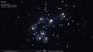 Kartika is an Oceanic name from Bali (Indonesia). The lintang of kartika is found in intersection of Buda (Wednesday, in saptawara) and Wage (in pancawara) in a series of palelintangan. Lintang kartika means star constellation.[1]